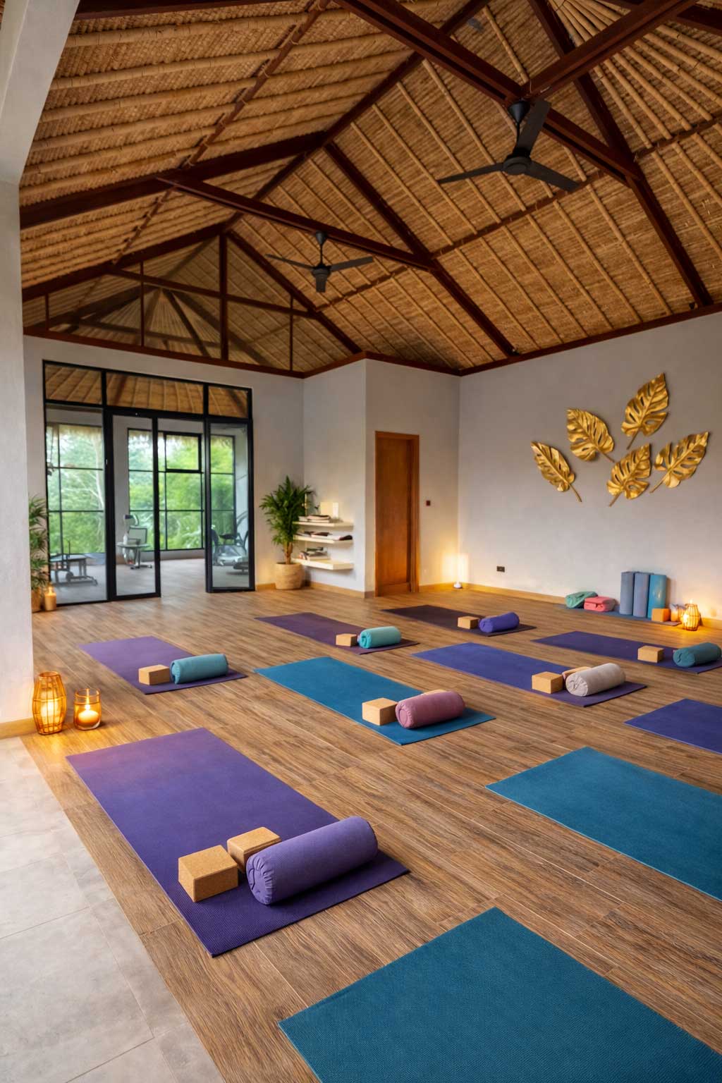 Soft lighting, natural materials and open space create the perfect setting for yoga and meditation.